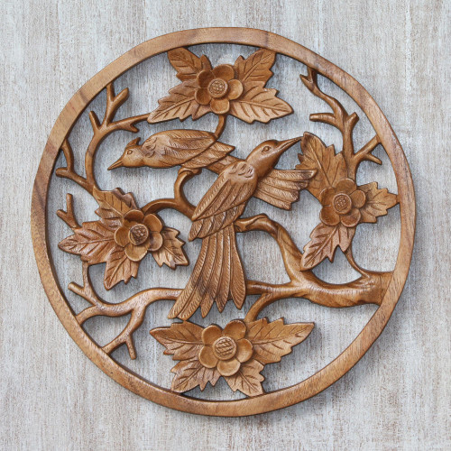 Handgefertigtes Reliefpaneel Aus Suar Wood Mit Vogelmotiven Aus Bali Singvogel Paar Novica